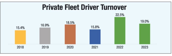 Meanwhile, among private fleets, driver turnover returned to more normal, if elevated, levels in this year’s National Private Truck Council’s Benchmarking Survey Report, reflecting 2022 statistics — after eclipsing the 20% threshold for the first time in the history of the survey last year.