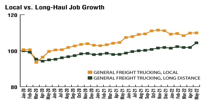The National Transportation Institute used data from the Bureau of Labor Statistics to show the growth in local trucking jobs compared to long-haul from 2020 to 2022. Local jobs fully recovered and surpassed the January 2020 baseline in July 2020, but long-haul jobs did not fully recover until September 2021. Local trucking jobs grew by nearly 10% from January 2020 through May 2022, but the number of long-haul jobs grew only 4.3% — and that’s only due to a big jump in May 2022. In April 2022, long-haul jobs had grown just 1.77% from the January 2020 baseline, compared to 9.75% for local driving jobs in the same time frame.