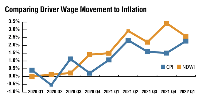 Driver wages have grown at a rate higher than inflation since the beginning of 2021, as shown by this graph comparing NTI’s National Driver Wage Index (NDWI) growth rate from previous quarter to the Consumer Price Index (CPI) growth rate from previous quarter. (Not seasonally adjusted.)