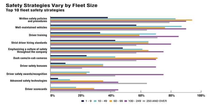 When HDT broke out in-cab cameras this year as a separate choice instead of including it in “advanced safety technologies,” use of advanced technologies dropped from No. 6 to No. 9 on the top 10 fleet safety strategy list. Larger fleets are far more likely to use advanced safety technologies than smaller fleets. Smaller fleets depend more on keeping their vehicles well-maintained than other safety strategies. For larger fleets, written safety policies and procedures and driver training are key.