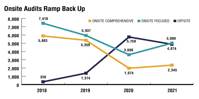 After the COVID-19 pandemic forced the use of far more offsite compliance reviews in 2020, some believed we would see greater use of this tool going forward, pushing total audits for 2021 well over the numbers seen in 2017 and 2018. However, it appears that the use of onsite audits, especially focused audits, were coming back in 2021, while the number of offsite audits actually dropped slightly from 2020.