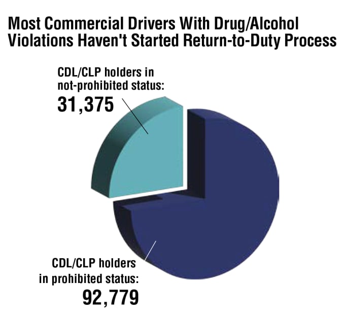 Most commercial drivers with a drug or alcohol testing violation haven't even started the return to duty process, and most of those probably will find another career. As of May 1, 2022 (the most recent report available), more than 124,000 commercial driver’s license or commercial learner’s permit holders had been reported to the clearinghouse as having at least one violation. Close to 92,800 of those were still in prohibited status as of May 1. Nearly 70,000, 56% of those with reported violations, had not started the return-to-duty process. Only 31,375 had been cleared as no longer prohibited from performing safety-sensitive duties after a negative RTD test – just 25% of the total drivers with violations.