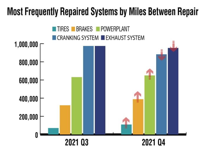 The top five most frequently repaired systems in the graph accounted for nearly 67% of all reported roadside repairs. Miles between roadside repair of tires improved nearly 55%, the greatest gain.
