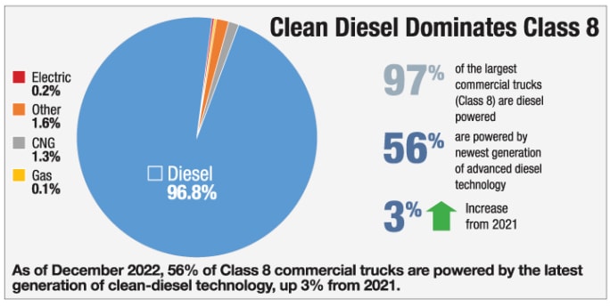 As of December 2022, 56% of Class 8 commercial trucks are powered by the latest generation of clean-diesel technology, up 3% from 2021.