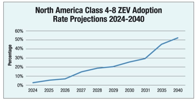 In the third edition of ACT Research’s Charging Forward report, a 2024-2040 decarbonization forecast, we predict a relatively low adoption rate of Class 4-8 zero-emission vehicles from 2024 through 2026, reflective of the fact that sales of battery-electric commercial vehicles are still in their early years.