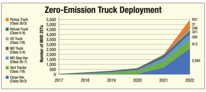 In electric yard tractors, Calstart reports 1,541% growth in deployments from January 2017 to December 2022. The deployment of Class 8 ZETs overall experienced 7,167% growth from January 2020 to December 2022.