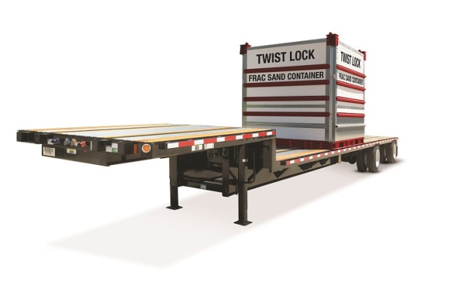 To stand up to this demanding service, he says Fontaine starts with “the strongest main beam design in the industry, the Fontaine XtremeBeam. Then we inset the twist-lock mechanism behind the side rail to protect it from side impacts.” By contrast, he says that cutting out the side rail makes the trailer weaker and interrupts the load securement system, “causing more problems when the trailer is used for traditional flatbed loads.” He notes that Fontaine twist locks are positioned on the deck to match the frac-sand container size. “They retract flush with the floor so a user can haul typical drop-deck loads and frac sand with the same trailer for greater hauling versatility,” adds Webb.
