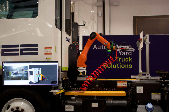 ISEE’s technology autonomously couples the trailer and connects the airlines without any trailer modifications, adapters, markers, or remote control, using a six-axis robotic arm on the back of the autonomous yard truck cab.