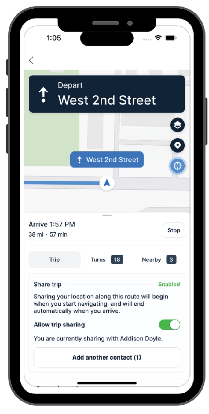 New Pulse+ geolocation features, powered by TruckMap, allow drivers to share routes with carriers, shippers, and loved ones. Location-dependent actions can be triggered based on a driver's location, such as a “welcome back” message when a driver returns to the terminal.
