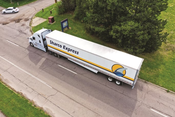 Sharco runs new 2017-2019 Class 8 tractors and constantly updates its 60-truck fleet to capitalize on new technology. Trucks are governed at 65 mph, and the company’s tire program, driver fuel bonus, and anti-idling in-cab technology all help with fuel economy. This year it replaced the roof on its 18,000-square-foot warehouse to reduce energy use and installed LED lighting and started using data analytics to reduce deadhead mileage and out-of-route fuel stops. Trailers are equipped with automatic tire pressure systems.