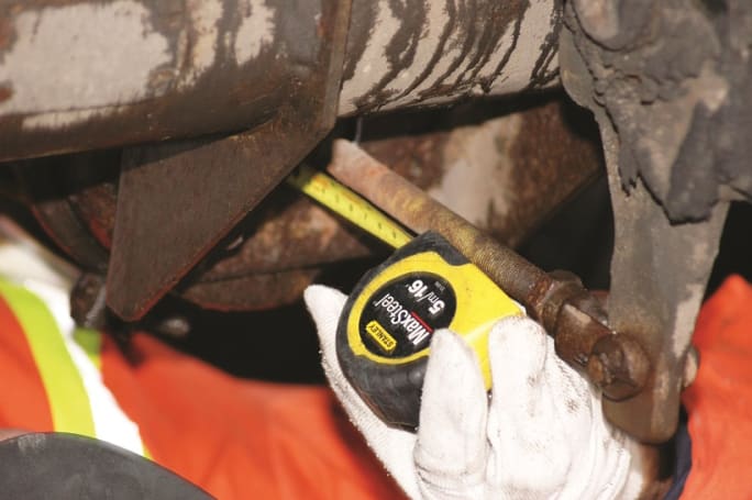 In this approach, properly chock and secure the vehicle, then climb underneath it and using your hand or a suitable pry bar, pull back on the pushbar away from the brake chamber and measure how much play is present in the pushbar’s range of motion.