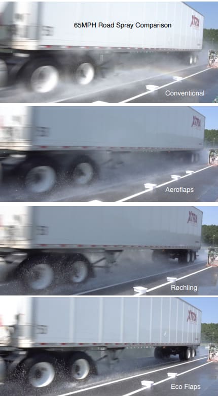 Slotted mudflaps are one of many attempts at reducing splash and spray. There are also textured mudflaps that look a bit like AstroTurf. There are broom-like spray suppression skirting from the likes of Fleet Engineers mounted above drive and trailer axles designed to keep water from the wheels from escaping into the slipstream. These and other technologies have some impact on spray, but not all fleets see the value in installing them.