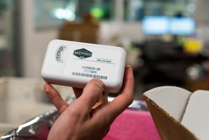 A Bestpass employee installs a toll transponder in a fleet vehicle.