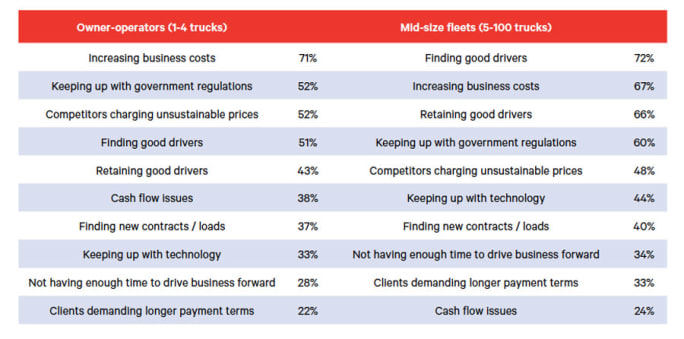 When asked about their key challenges, those businesses operating fewer than five trucks reported increasing business costs (71%), followed by keeping up with government regulations (52%) and competitors charging unsustainable prices (52%). Only a little over half, 51%, cited finding good drivers.