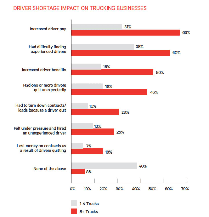 Given the difference in the driver challenge, it’s not surprising that 66% of the 5- to 100-truck fleets said the driver shortage had led them to raise pay, compared to only 31% of 1- to 4-truck operations.