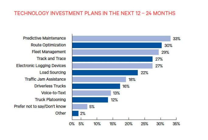 When asked about investment plans in the next 12-24 months, the number one choice was predictive maintenance at 33%, followed by route optimization (30%) and fleet management (29%). The top reason for investing in technology was to reduce costs (30%), followed by keeping up with the competition and saving time, both at 18%.