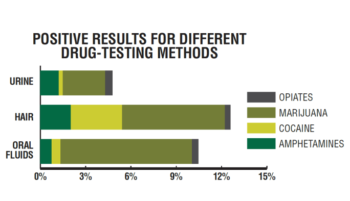 Because hair and oral fluid testing are not part of the DOT drug-testing regulations, this data from Quest Diagnostics for 2018 compares its positivity rates for urine, hair, and oral fluids testing among the general U.S. workforce.