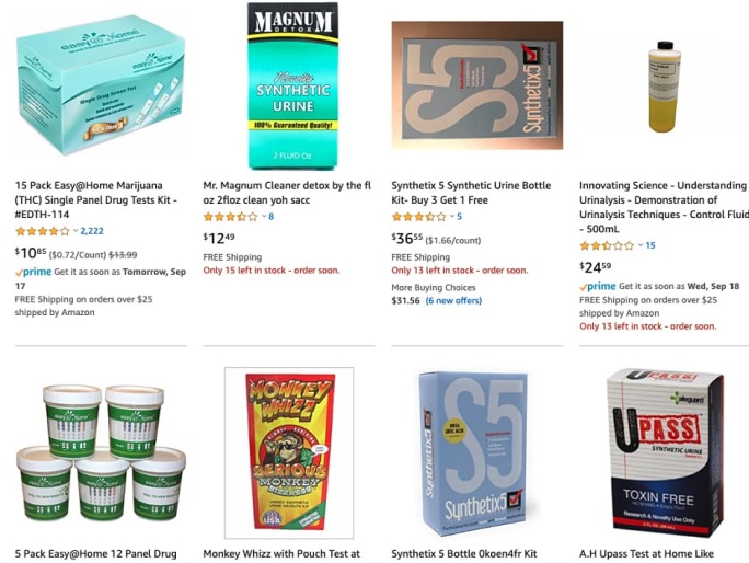 Synthetic urine is essentially water that has been fortified with a mix of chemicals (such as creatinine), salts, and yellow coloring. It’s sold at head shops, truck stops, and on the internet, according to DrugAbuse.com, and it’s often sold with temperature-sensing strips and/or hand warmers to make sure it’s at the proper temperature.