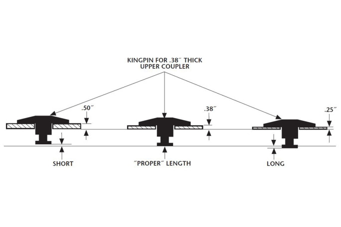 8. If kingpin replacement is required, a replacement kingpin should be selected which is similar to the type removed, or if a different style, one which can be adequately braced. The kingpin must also be matched to the thickness of the upper coupler to maintain the SAE dimensions. Kingpins are manufactured in different lengths to match the thickness of the upper coupler. Improper selection will result in a kingpin that is too long or too short as indicated in Figure 6.
