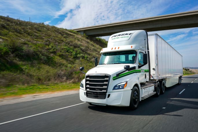 Penske is testing battery-electric Freightliner eCascadias in southern California.