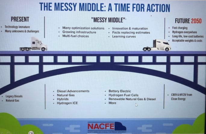 "Natural gas is clearly part of this 'messy middle,'" said Mike Roeth, executive director of the North American Council for Freight Efficieny. "And renewable natural gas is maybe one of the single biggest reasons why natural gas has such a big role in decarbonizing trucking as we move forward.".