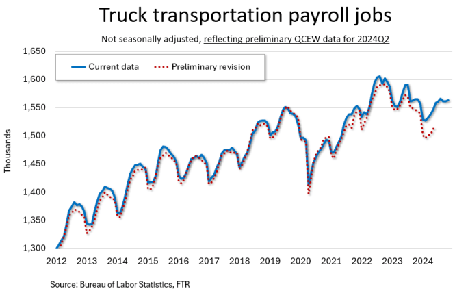 About half of the preliminary revision comes from general freight truckload, which had nearly 22,000 fewer employees in June than what BLS currently reports, according to the QCEW.