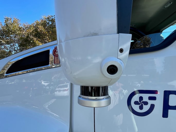 Plus sensors are located around the truck, including on the rear-view mirrors. Here you see a lidar sensor at the bottom of the mirror, with a side-facing camera mounted above. A rearward-facing camera (not shown) is mounted at the top of the mirror assembly.