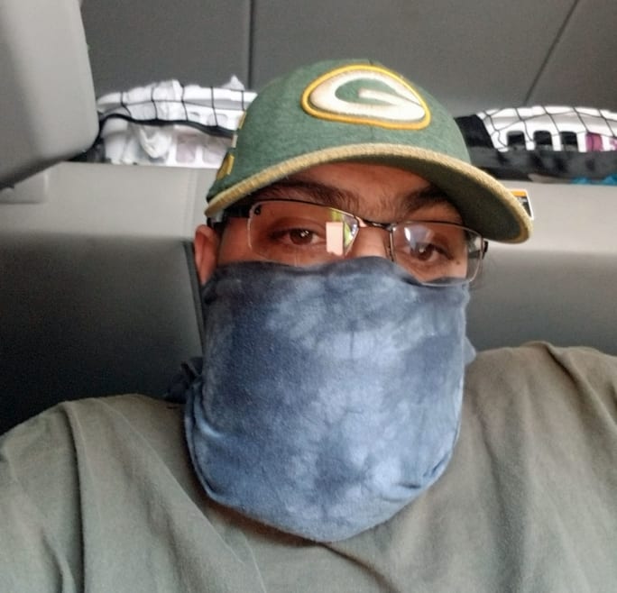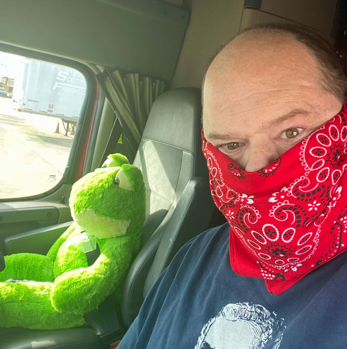 Roadmaster driver Joe Yuenger has a mask made from an old T-shirt.