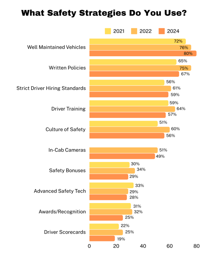 Asked what safety strategies they use, the top reply, as it has been all three years we’ve done this survey, is well-maintained vehicles.