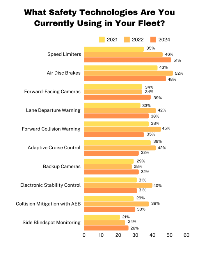 The federal government is considering mandating automated emergency braking for heavy trucks, but only 30% of respondents said they are currently using the technology. That’s actually down a bit from 2022’s 38%.