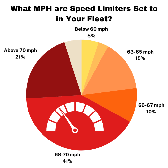 We also asked what respondents believed a mandatory speed limiter maximum speed should be set at. A little over one-third said 68-70 mph and another nearly one-third said about 70 mph. 23% felt speeds below 68 mph should be mandated.