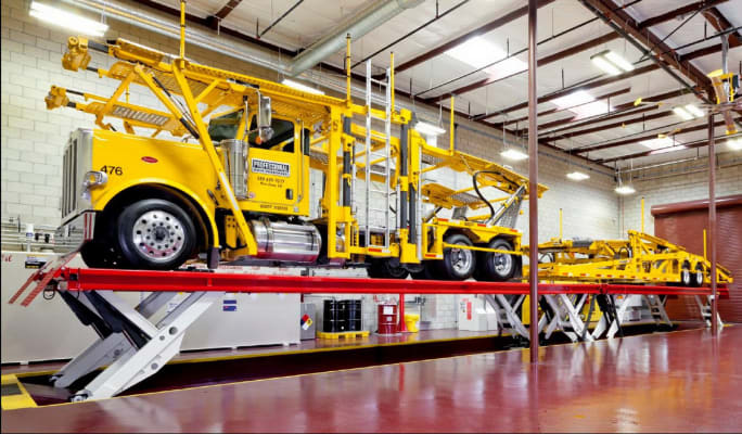 Platform lifts can be drive-on, back-off or drive-on, drive-off, depending on the layout of the shop and the yard. There is practically no set-up time required beyond driving the truck onto the lift and hoisting it into the air. Techs can get to work on the truck almost immediately.