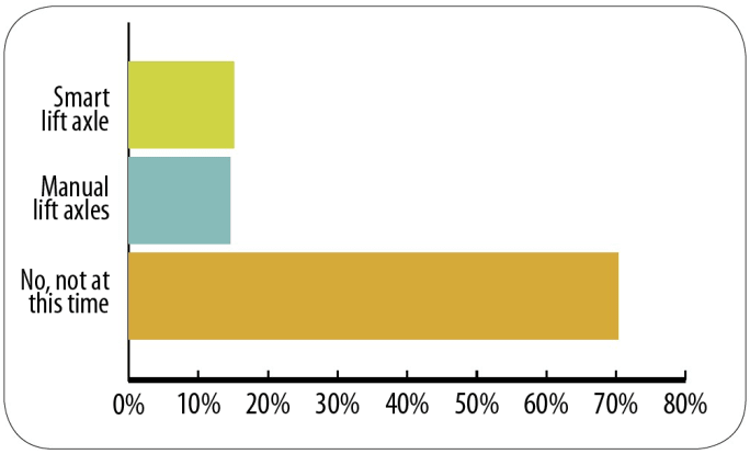 While there is new tech out there to ease the ride, most of the fleets are not currently considering adding smart lift axles or manual lift axles. Only about 15% said they use or are considering using smart or manual lift axles.