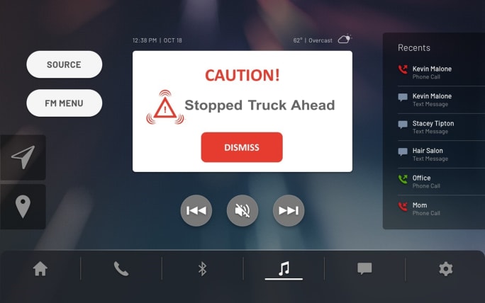 A screen capture of what would appear on the in-vehicle screen unit of an upcoming driver as they approach a truck with DeliverSAFE activated.