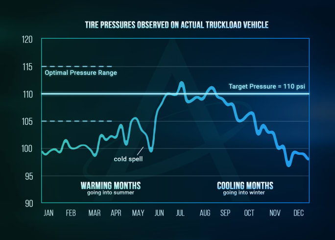 The effects of temperature fluctuations on tire pressure. Notice the increased tire pressure during the day and in warmer months, and decreased pressure during the evening and in cooler months.