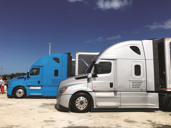 Two new Freightliner Cascadias were offered up to reporters for a test drive in Florida, both equipped with the full Detroit Assurance 5.0 package including Lane Keep Assist and Lane Departure Protection. I drove the blue truck on my second drive in Portland two months later.