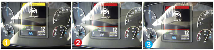 Nothing happened for the first 15 seconds, then a yellow alert appeared on the dash display, with the words, “Hands On.” I ignored that, and after an additional 15 seconds, the alert turned to red, accompanied by a beep. The beeps continue every 5 seconds until a full minute has elapsed with no steering input from the driver. After 60 seconds, the beep becomes constant and the Lane Keep Assist feature is disabled, indicated by the blue steering wheel icon going out. If three such sessions are logged, the Lane Keep Assist is locked out until the next key-on cycle occurs — and the fleet is alerted that the driver is misusing the system.