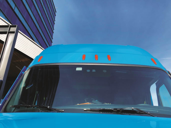 Daimler has baked these features into the latest version of its driver safety suite, Detroit Assurance 5.0 (see page 50). Active Brake Assist uses “fused” radar and camera technology to provide emergency full-stop braking capability without action from the driver. ACC to Zero (Adaptive cruise control to 0 mph) provides full acceleration and service brake capability from any set cruise speed down to a full stop, and it can launch again after the full stop if the interval doesn’t exceed a couple of seconds. As with previous generations, ACC maintains a set following distance from a vehicle ahead of the truck based on a pre-set time interval (2.4 to 3.6 seconds).