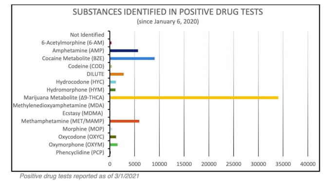 As of March 1, nearly 63,300 total drug violations had been reported since the Clearinghouse began operation. Nearly 53,000 of those were due to a positive drug test (81%), more than 9,000 due to refusing to take a drug test, and more than 1,500 were “actual knowledge of a drug violation.”