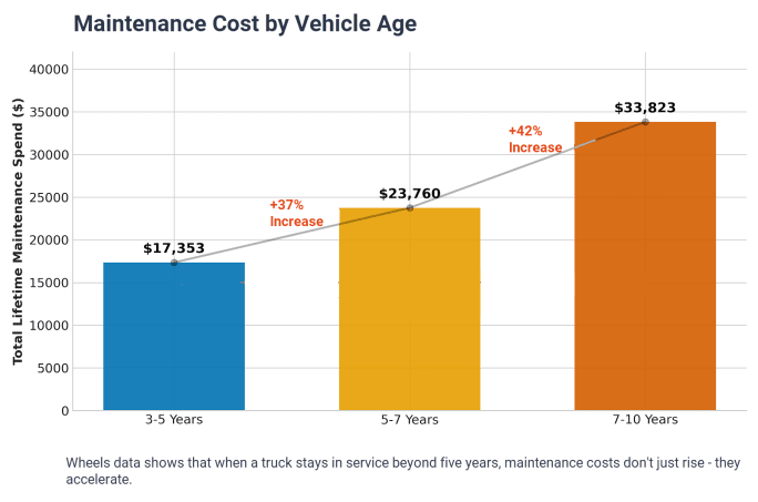 When a truck stays in service beyond five years, maintenance costs increase by roughly 10% each year, according to Wheels fleet lifecycle data, and the total lifetime maintenance spend rises by nearly 49%.