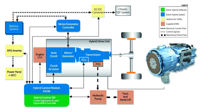 The Eaton Hybrid Drive HEV parallel system uses patented controls to blend engine torque with electric torque to move the vehicle.