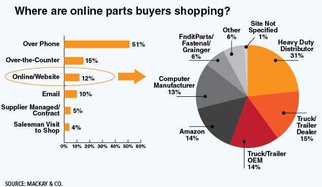 Aftermarket research firm MacKay & Co. found in a recent survey that fleets ordered 12% of their parts online. John Blodgett, vice president of sales and marketing, reports that survey respondents also indicated they expect online parts purchases to increase to 15% of total purchases in the next three years. (See graph on opposite page.) Interestingly, 31% of those parts were purchased through a heavy-duty distributors’ website, with Amazon seeing 14% of total online parts purchases from the surveyed fleets. (See graph on page 48.)