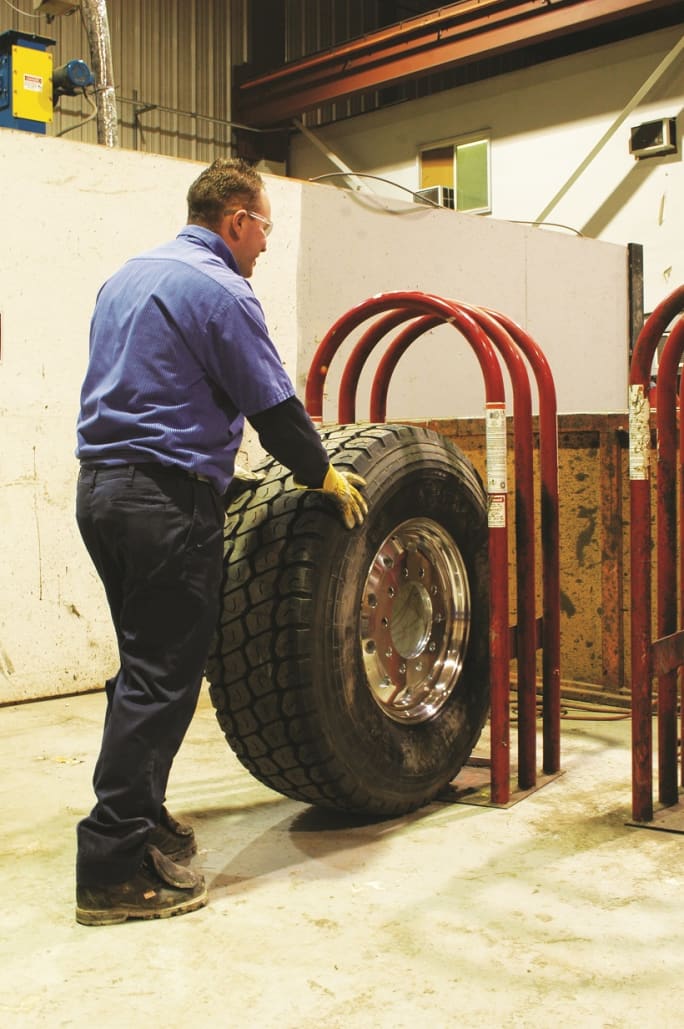 Technicians should verify the desired inflation pressure with either the tire manufacturer’s load and inflation table or the fleet’s preferred inflation pressure, usually based on tire type and wheel position. Before the tire is inflated, it must be rolled into an inflation cage for the safety of the installer and everyone else in proximity to the tire.