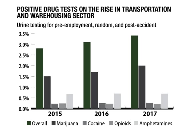 Quest Diagnostics reports that between 2015 and 2017, the transportation and warehousing sector experienced the largest overall drug-test positivity increase of any sector, in large part due to significant increases in positive tests for cocaine and marijuana.
