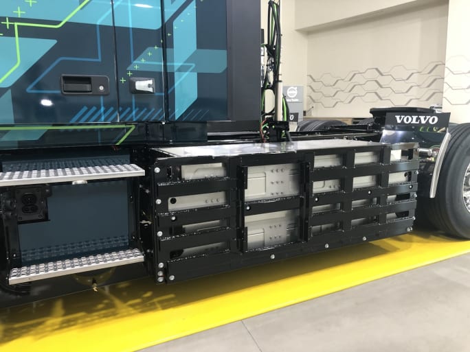 The most notable difference on the all-electric Volvo VNR are the massive battery packs on the frame rails ahead of the drive tires.