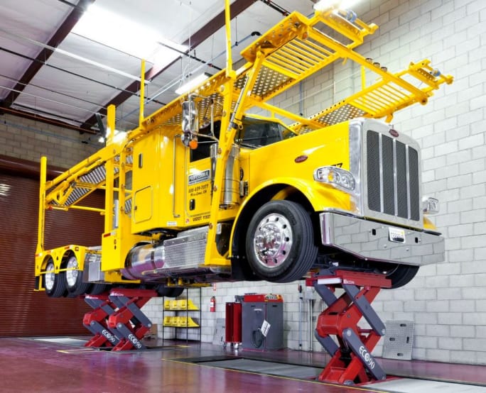 The Skylift platform lift from Stertil-Koni can be configured to lift an entire tractor trailer in a drive-on, drive-off application for quick services like chassis inspections and oil changes.