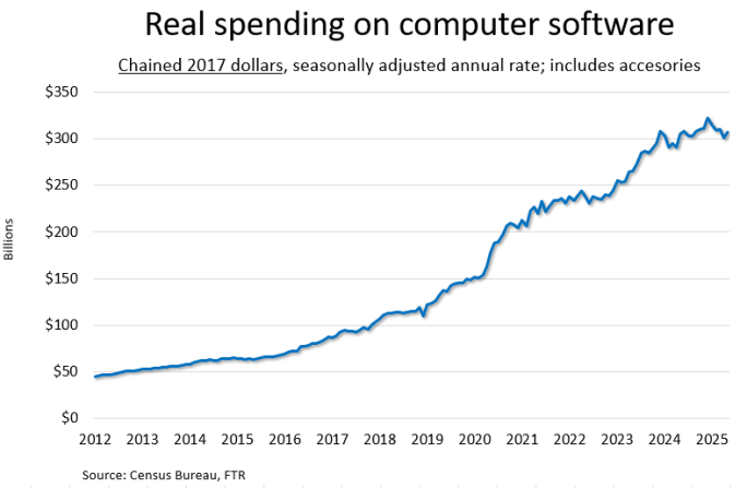 Real spending on computer software and accessories stabilized in 2021-2022 but took off again in early 2023. Coincidentally or not, the beginning of 2023 is when local delivery employment and real nonstore retail sales diverged. Sales rose strongly, while jobs were basically flat until the end of 2024.