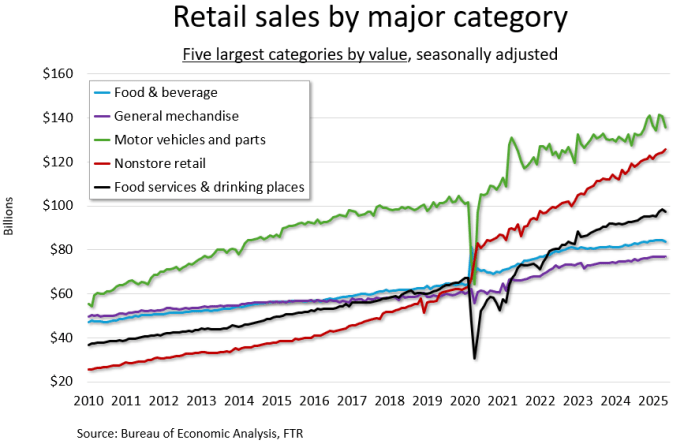 By the end of lockdowns, it ranked second and has steadily gained on the motor vehicles and parts retail category. If trends continue, it’s conceivable that nonstore retail sales could exceed sales of vehicles and parts within a couple of years.