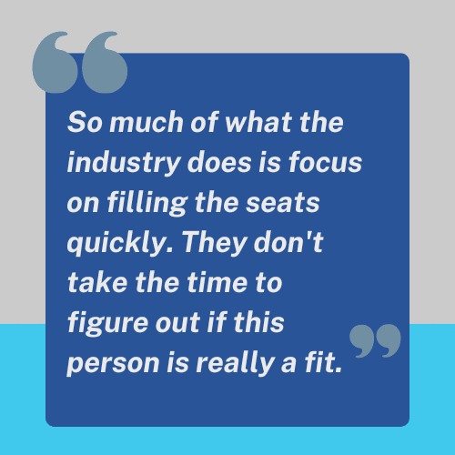 “But as long as the industry continues to focus on hiring based on pay and based on getting someone in that seat fast rather than finding the right fit, you’ll continue to see turnover high, because you’re going to end up with the wrong people in the seats.”