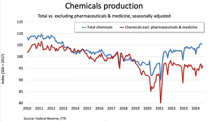 Industrial gas production is running at close to its highest level since 2008, and agricultural chemicals — pesticides, fertilizers, etc. — are close to their highest output in a decade. On the other hand, the key group of basic chemicals looks more like the broader category of chemicals excluding pharmaceuticals.